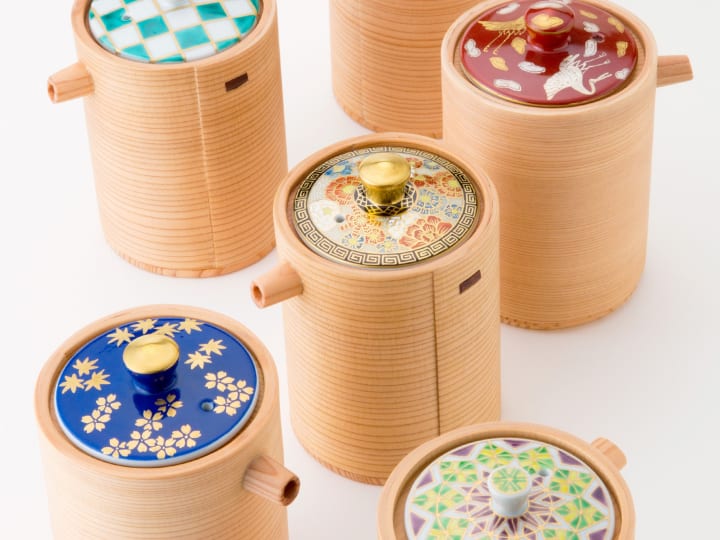 京都と秋田、それぞれの伝統工芸品の特徴を生かした曲げわっぱ酒器シリーズで、秋田杉の流れるように美しい木目に、京の文化が育んだ雅な色絵を組み合わせたもの。自然が生んだ温もりある素材と、華やかで繊細な手わざの組み合わせが目にも楽しい商品だ。