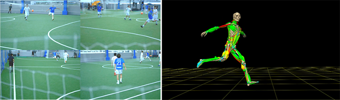 ▲12台のカメラを用いて、フットサルの試合を行っている全選手のモーションを取得している様子。可動域まで考慮した関節角度を計算することで、骨の動きをCGとして描いている。