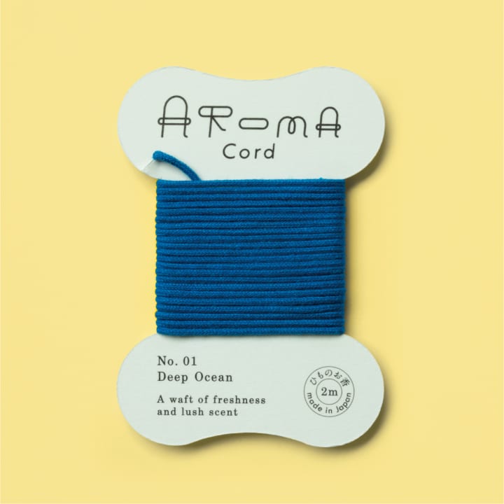 AROMA Cordは、9種の香りのラインアップがあり、焚くと消臭・抗菌効果を発揮し空間全体に香りが行き渡るお香でありながら、ラッピングのリボンや、水引の代わりとしても楽しむことができる新しい形の商品だ。