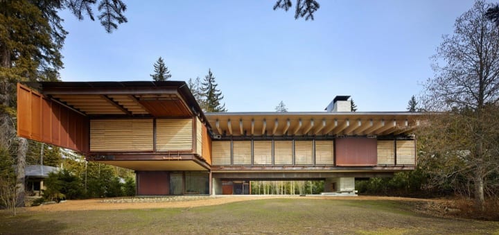 ファサードはクランクやスイッチを使って、ガラス張りのオープンな状態にしたり、ベイマツを使ったルーバーで少し明かりを取り込んだり、錆色のスチールで完全に閉じてしまったりと、さまざまな調節ができる。