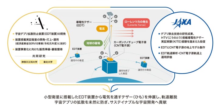 この装置を打ち上げ前の人工衛星に搭載し、人工衛星のミッション終了後に長い紐を宇宙空間で展開することで、地球磁場を使って人工衛星の軌道を変更。人工衛星の軌道高度をより短期間で降下させることで、人工衛星を地球大気に再突入・焼却廃棄することができるそうだ。