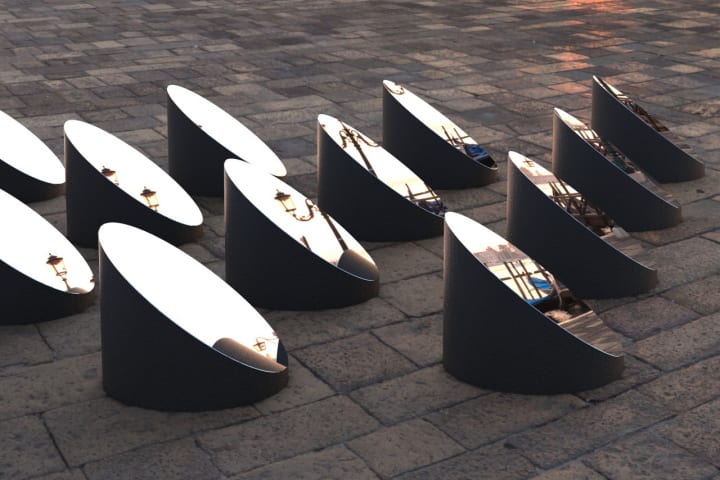 サン・ジョルジョ・マッジョーレ教会の前にあるRiva degli SchiavoniとPalazzo Ducaleで披露されたそうで、周囲にある建築や頭上の空を文脈から切り離し、つかみどころのない要素へと還元。道行く人に現実のずれた没入感を与え、抽象的な印象を抱かせるのだ。