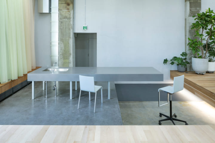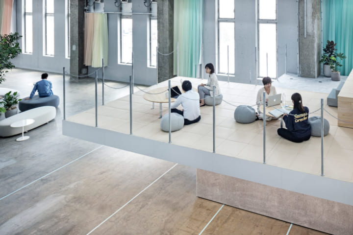 積み重なった段は、家具としては大きく、建築としては小さいスケールで、家具と建築の中間的なものだという。この独特のスケール感によって、変革を求められる時代のオフィスに必要な、働く人が使い方を自由にアップデートしていける、余白のある空間ができあがった。![]()