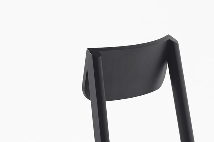 そこで、双方のメリットを生かしたスタッキングチェアのデザインを構想。まずは、丸い断面の部材でフレームを構成。そこへ成型合板製の背と座を取り付けたのち、最後は脚と背もたれのフチを直線的に削ぎ落とすことで、部分的に四角い断面のような平面と稜線を持つチェアが生まれた。