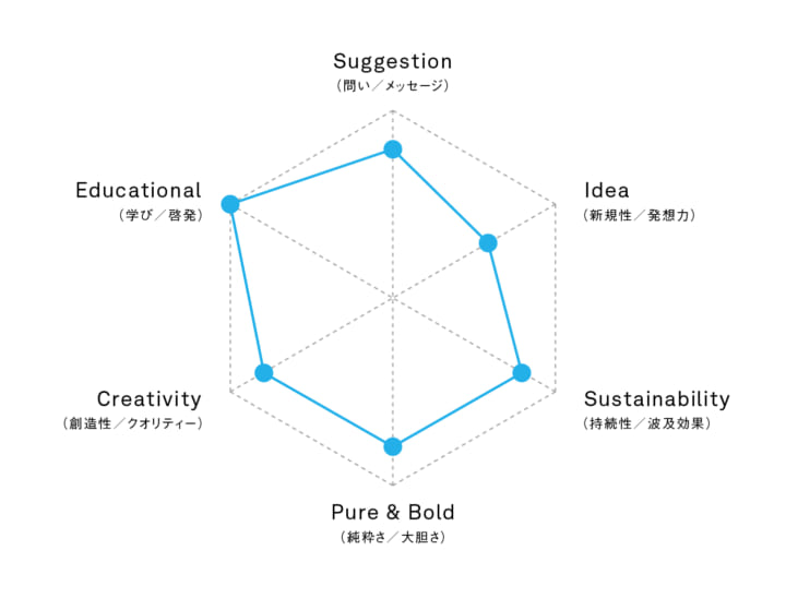 ▲本プロジェクトをレーダーチャードで示しました。6つの属性のうち、成果物のデザイン性を「Creativity」で評価しています。「Pure & Bold」は目的に対して一途な強さを感じるか、やりきっているかという、SPREADが自らの仕事において大切にしている視点です。