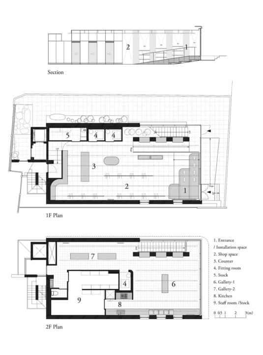 ギャラリーフロアである2階は、1階と同じ天然石で床を仕上げつつ、壁やキッチンカウンターは彩度の高い左官仕上げを採用。ブランドイメージからインスピレーションを受けたカラーで、フロアに上がった瞬間に1階とは異なる雰囲気を感じられるようになっている。![]()
