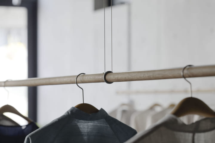 また、アプローチも含めて一体的な空気を作るため、外構周りから内部にかけて、床は全て同材の天然石を張り込んでいる。そこに、オーク材や布クロスのほか、照明や吊り下げラックなどを必要に応じてカスタムできる、溶融亜鉛メッキ仕上げのオリジナルの照明ラインを掛け合わせることで、天然素材の持ち味を生かしたものづくりを行うヨーガンレールにふさわしい素材構成ができあがった。