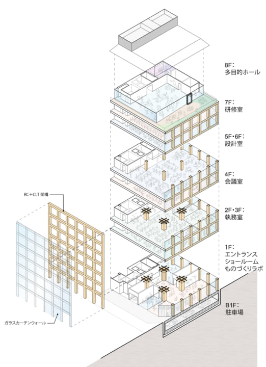 同ビルは、プリツカー賞を受賞した建築家・坂 茂の設計によるCLT(直行集成材)を活用した地上8階・地下1階の木質免震構造オフィスビルで、2021年11月に竣工予定である。