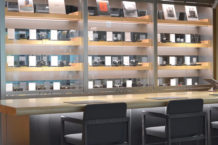 インテリアデザインを担当したトネリコの米谷ひろしは、今回の空間イメージについて、①写真機が美しく映えること。②絵になり、背景となること。③細部にわたる「安心感」と「信頼感」をポイントとして挙げている。実際に訪れてみると、数多くの商品と複数のサービスを提供することを鑑みたとき決して広い面積とは言えない同店が全フロアにわたって統一された世界観に包まれていること、フロアごとに異なる空間体験ができる楽しさを実感した。いくつか特に印象に残っているフロアを紹介していく。