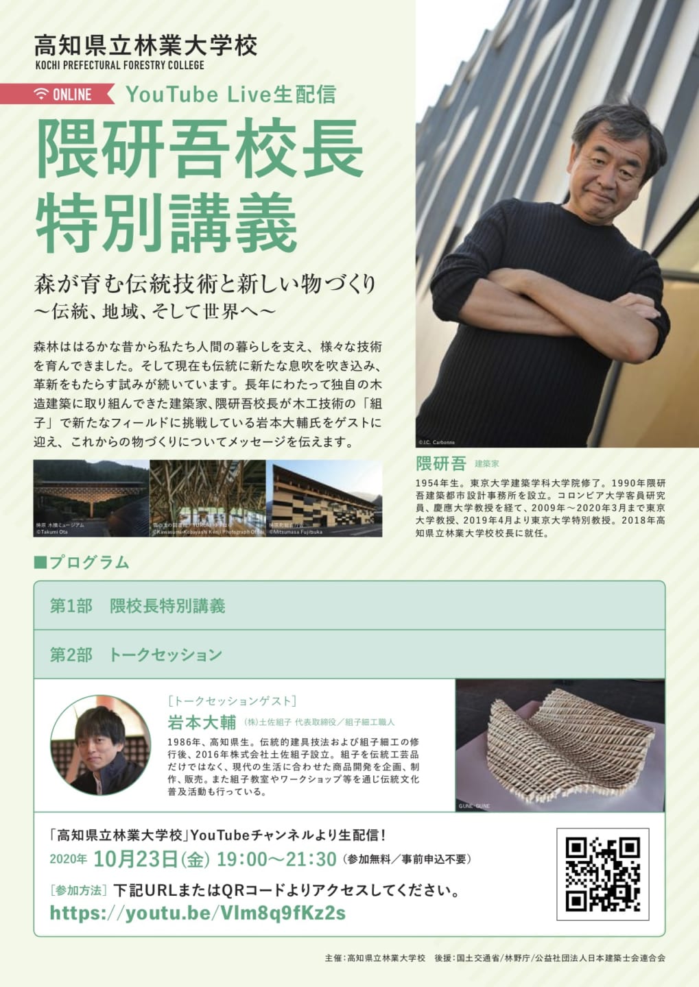 建築家・隈研吾が校長を務める高知県香美市の高知県立林業大学校は、2020年10月23日(金)に、同氏による特別講義をオンラインで開催する。