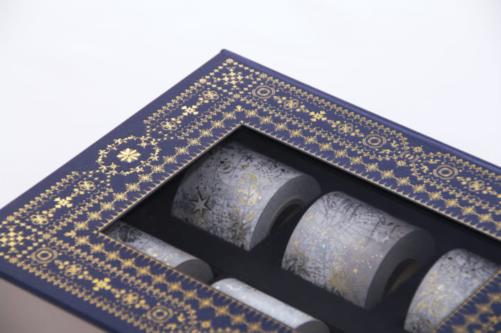 美しいデザインと高度な箔押し技術を使った「箔押しマスキングテープ」を展開するコスモテックだが、同商品は、マスキングテープをコレクションとして集めている人のための紙製収納ケースである。