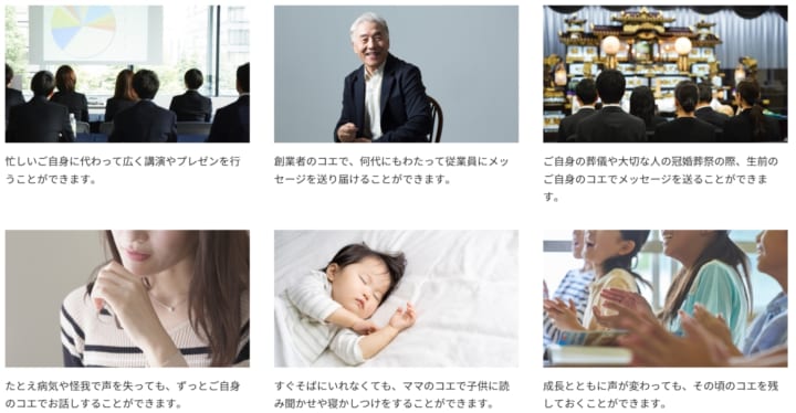 今後は、SNSメッセージを送信者本人の「コエ」で送ったり、スマートスピーカーの音声を身近な人の「コエ」で出したりなど、各種サービス企業との連携実現を目指すとしている。![]()