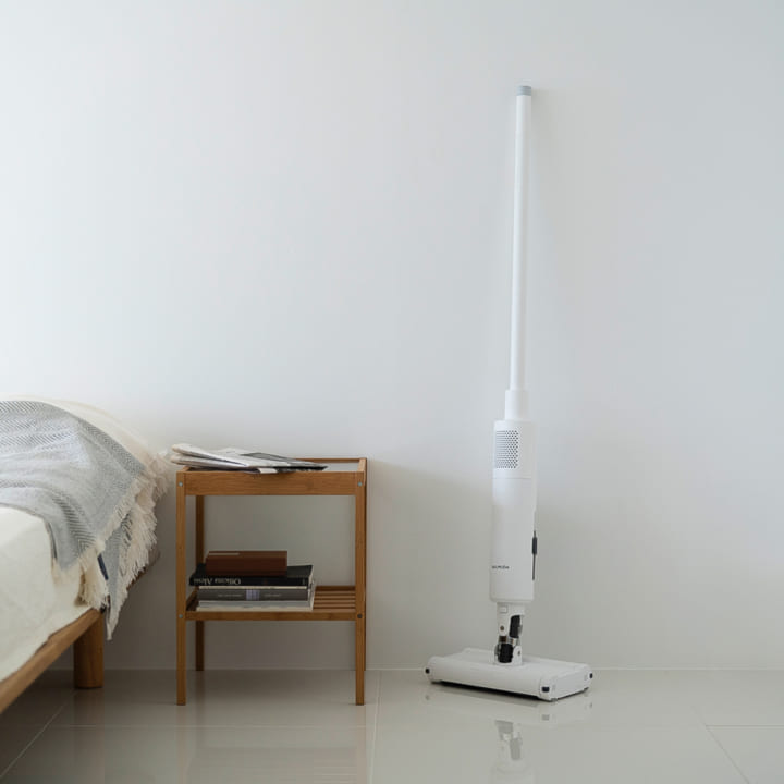 使っていないときは、立てかけられた一本のほうきのようにシンプルで自然な佇まいで、現代の掃除機がどんな姿であるべきかを考えてデザインされている。