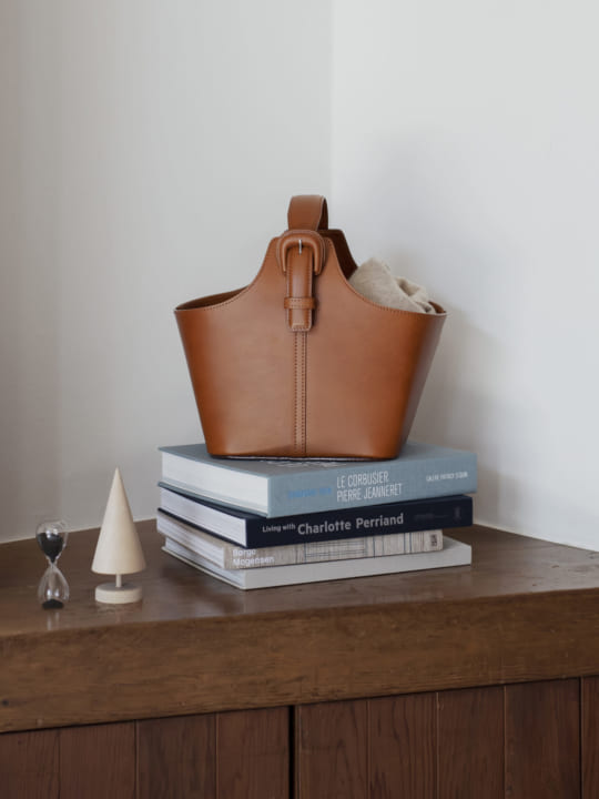 上質なレザーバスケットは、インテリアとしても収納としても楽しめる、存在感を放ちながらも空間になじむシンプルなデザイン。革巻きの持ち手やバックルは、鞄づくりの技術がつまったこだわりポイントだ。また、内装にはやわらかい手触りの「ピッグスエード」を採用。しわが寄らないよう、職人がひとつひとつ丁寧に仕上げているそうだ。
