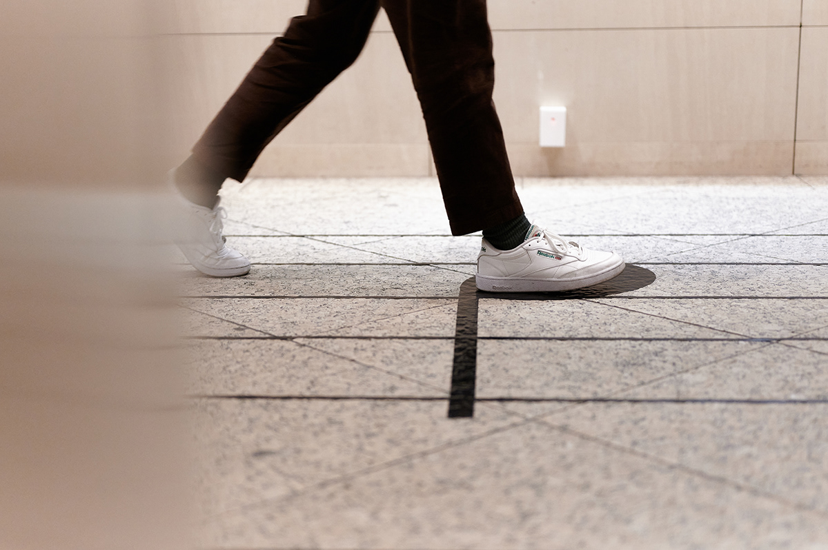 SOCIAL HARMONYは、床に描かれた大きな楽譜上の音符の上に立つとその音階の音が鳴るというもの。列に並ぶ人がみんな音符の上に立つことで、自然と楽しくソーシャルディスタンスを保つことができる。