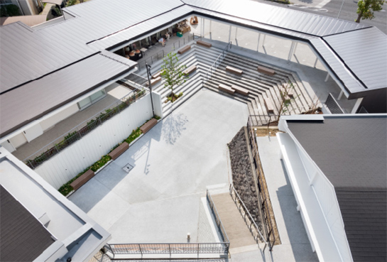北団地の屋外空間の良さを活かすために、建物と地形の関係性を高めることを考え、サンクンガーデンをより広く階段状に改修。軒下空間と関係づけることによって、既存建物・周辺環境を含め全体として「集まり」を感じる空間を作り上げた。