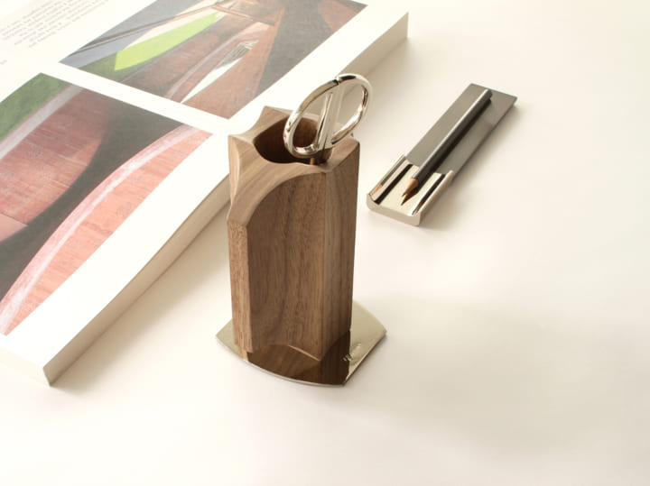 天然木を彫刻的に削り出されたフォルムと、ラグジュアリー感が漂う金属プレートが一体になった、ホームオフィスツールとして使えるホルダーで、クリエイティブなデスク空間を演出してくれるそうだ。