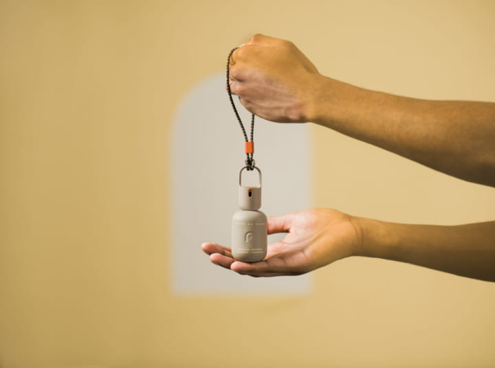 再生プラスチックやテキスタイルなどの素材は、柔らかな手触りのものを使用。人間工学にもとづいた丸みのある形状で、扱いやすいものとなっている。さらに、手指消毒剤ボトルと除菌シートケースにはストラップが付いているので、鍵やバッグに取り付けることもできる。
