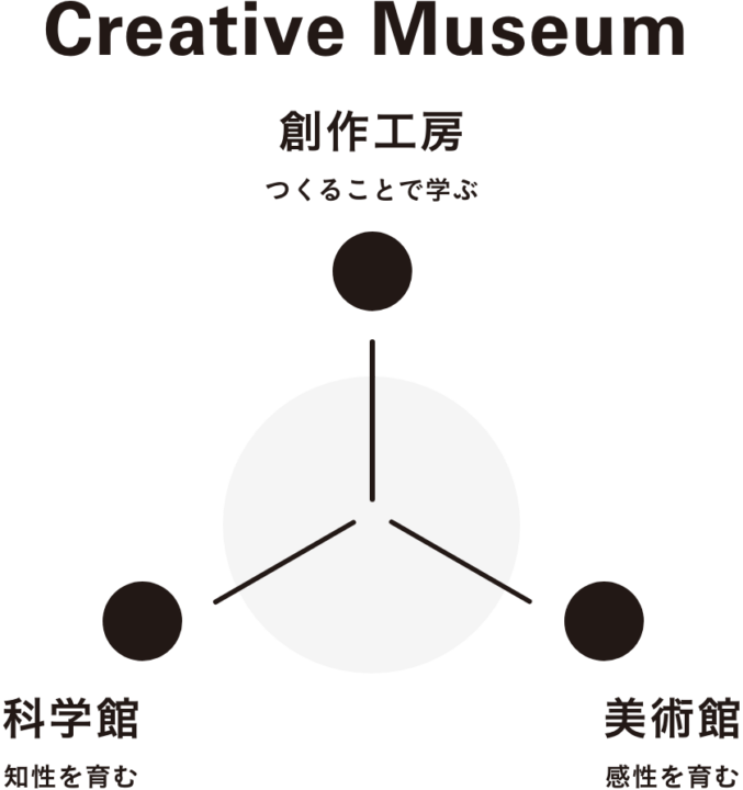 同館は、「”ひらめき”をカタチにするミュージアム」をコンセプトに、知性を育む科学館の要素と、感性を育む美術館の要素を兼ね備えた、学びや体験を通じてクリエイティブな力を育む場である。