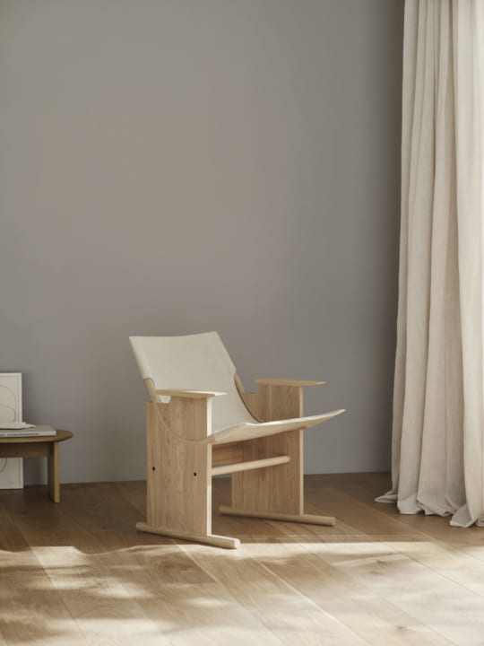 このチェアは、オーク材を使った2枚のサイドパネルのあいだに、天然由来のリネン生地をハンモックのように吊して座面にしたデザインで、ゆったりとした快適な座り心地を提供している。