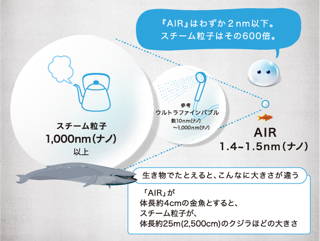 水粒子の大きさは、一般的なスチーム式加湿器と比べると1000分の1のサイズ。同社の研究によると、変換された水粒子は肌の水の通り道より小さいので、奥の層まで浸透して潤いが長時間にわたって持続する特性を持つことがわかったという。