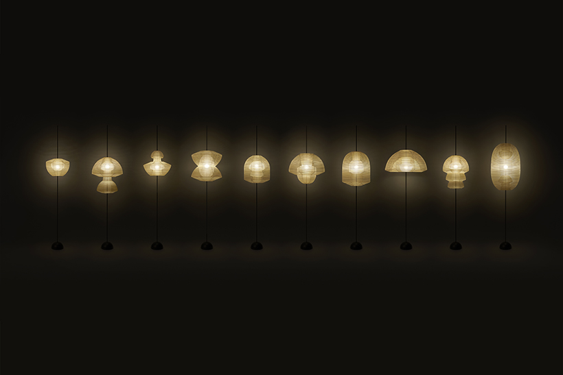 屋外で使われることの多い京提灯は、本来は厚めの和紙を使用するが、今回はこのデザインの特徴を活かすために、透過性の高い絹を表面に貼って仕上げており、京提灯のDNAを継承しつつも、その質実剛健な佇まいとはかけ離れた、軽やかで多層性のある提灯ができあがった。![]()