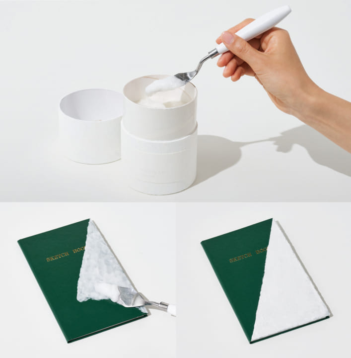 同じく審査員が注目した「NURIKAMI – 塗紙 -」(NEW+YOSHIOKA 坂本俊太、吉岡俊介)は塗料の提案だ。身の回りのモノに塗ると、紙粘土の表面のような毛羽立ちのあるテクスチャーを付加することができる。色やビーズなどを混ぜてカスタマイズすることも可能だ。紙を塗料にするという発想は斬新だが、素材によっては剥がれやすくなる点や、使い方に難しさのある点などが課題とされた。