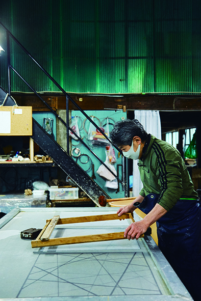 空間に現れる陰影のなかで、かすかな光の移ろい、揺らぎ、重なりという「カゲ」と「ヒカリ」による表情を生み出す壁紙・床材を実現させるために、卓越した技術を持つ日本全国の技術者・職人たちが参加した。