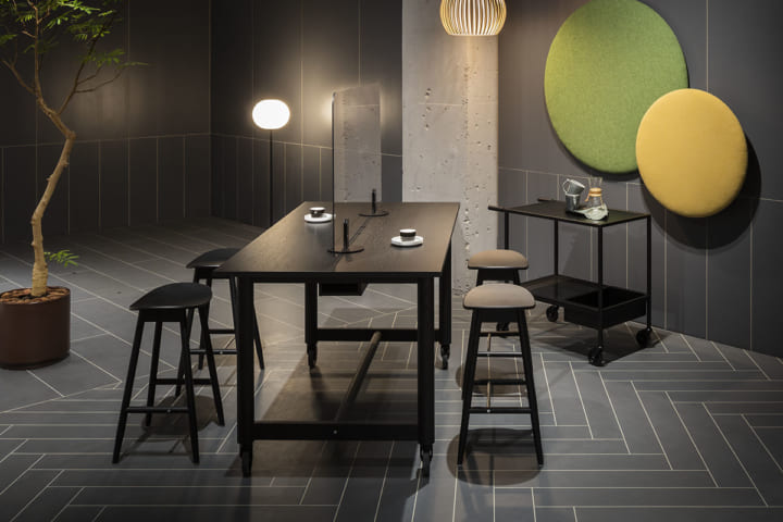 マットなダークグレーの面材にベージュの目地材を収めることで、目地が生み出す「線」に表情を与え、特徴づけることに。これにより、タイルやヘリンボーンフローリングの気配が感じられ、ひとつの大きな空間をグラフィカルな線によって緩やかに分節することも可能となった。