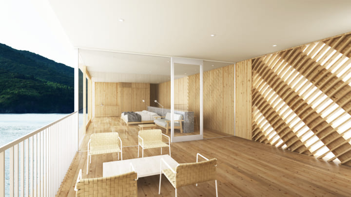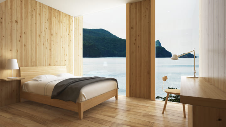 全面CLT工法を採用した施設コンセプトは、「Honest(正直さ、素直さ)&Seamless(隔たりや境目のないこと)」。隣接する港と同じく木の温かみを全面に表現するとともに、客室は間口を広くとり、目の前に広がるジオパークの風景や、島前カルデラをもっとも純粋に、たくさん感じられる設計となっている。