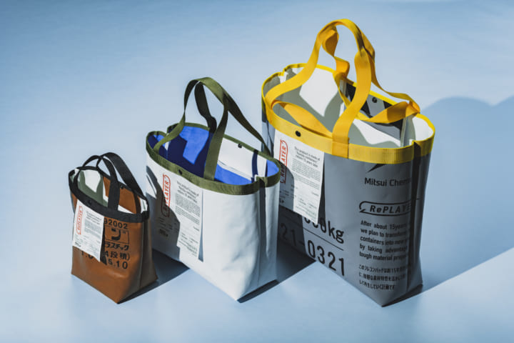 ▲柄がすべて異なる、フレコンをアップサイクルした「RePLAYERトートバッグ」。