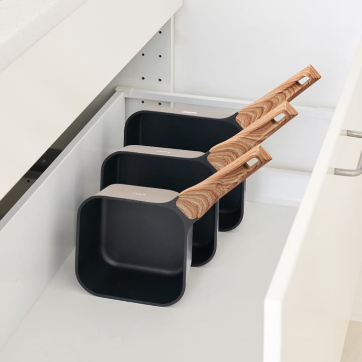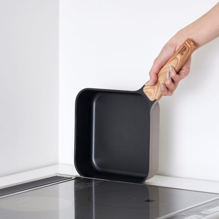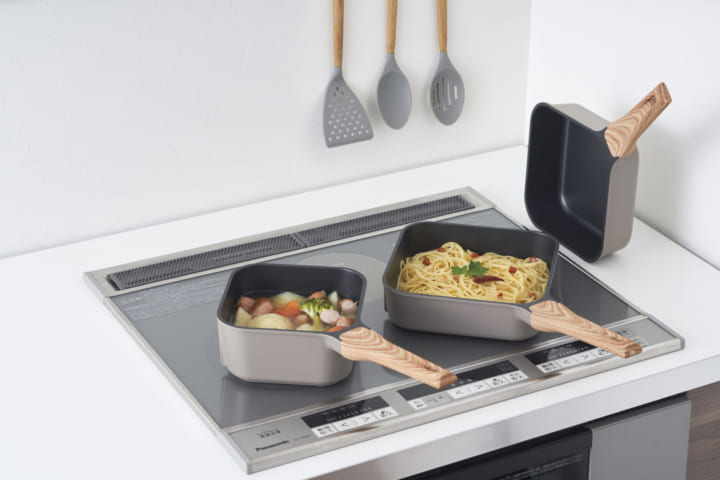 同製品は形状を四角にし、2側面にリブを立てることでフライパン本体が自立する。キッチンの空いたスペースやキッチンの下収納など、幅70~100㎜、高さ290~315㎜のスペースがあれば収納することができる。