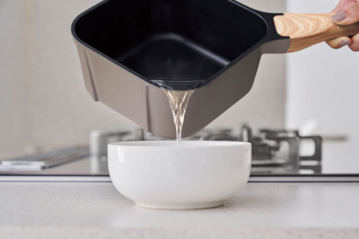 収納したフライパンを楽に取り出すために、角にハンドルを設置。男女ともに持ちやすい17cmのハンドルにしている。また、これにより、スープや具材が注ぎやすくなっており、レトルトパックや冷凍うどんもきれいに入るという。