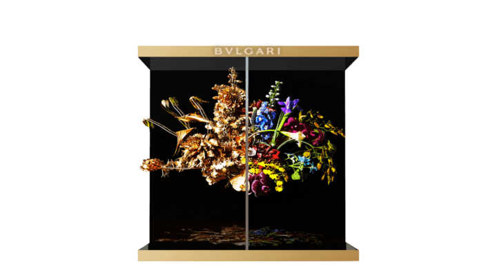 一方、「Golden Eden」は、ブルガリのアイコンである「セルペンティ(イタリア語で蛇の意)」を取り巻く自然環境を解釈したもの。3mx3mの左右対称の構造で再現された貴重な楽園の世界で、エキゾチックな季節の花で作られたボタニカル・スカルプチャーが宙に浮いている。