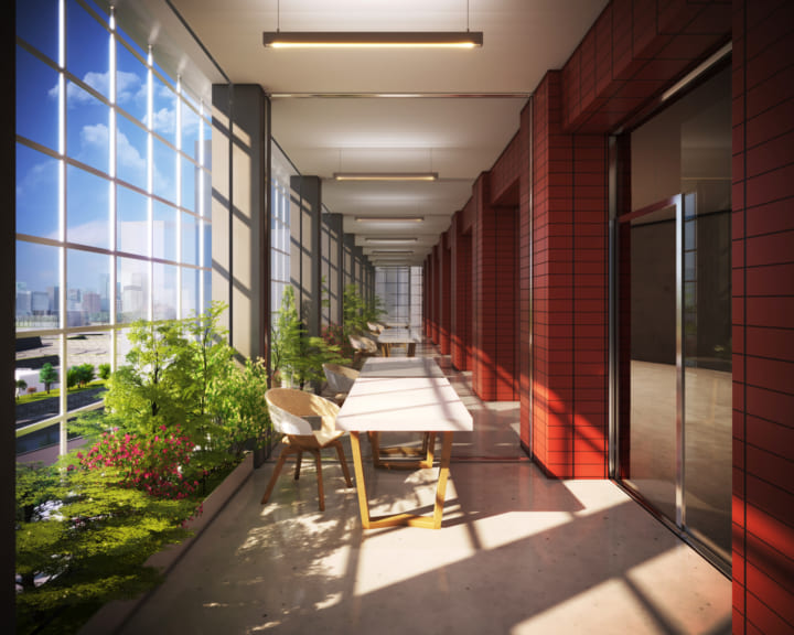 外壁に組み込まれた垂直の半屋外シャフト「グリーンシャフト」は、各層に自然換気とグリーンな景観を提供。また、ドローン専用の独立した軽物流動線やランディング施設としても機能する。