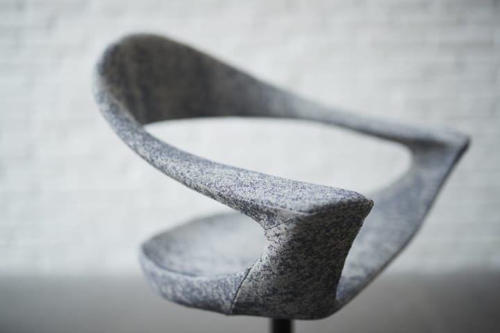 造形面では、身体を支える人の骨盤をモチーフに座面から肘掛け、背もたれへとひと続きの形状にして、身体に沿う有機的なフォルムをテーマに置いた。上部はモールドウレタンを使用し、脚部はアルミを採用。デザインはもとより、座り心地や張り地、強度、耐久性については、SOGOKAGUのデザインラボで5軸の機械を用いて1/1モデルをつくり、テストを重ねた。