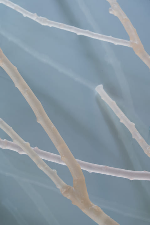 ▲「A moment in time-ume」展の作品(2021年)。梅の木の個性によって色が異なる。枝の作品は全長1m以上の大作。ほかにも鉱石のような層や、飴のかけらを集めたものなど、実験的な作品の数々が並んだ。Photo by Gottingham
