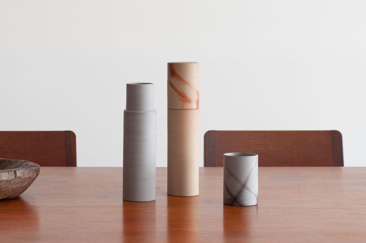 ▲DAIKURAの備前焼のウォーターカラフェ「hiiro」(2015年)。削り出しのシャープな形状と、シンプルななかに自然の質感を感じられる雰囲気に仕上げた。Photo by Fumio Ando