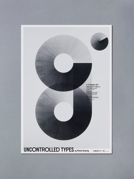 ▲「UNCONTROLLED TYPES by Plotter Drawing」(2017)。均質的なディスプレイ画像では表現できない、物質的な強さと重さに潜む美しさを紙に表現することを目指した。SHA.incとの協働作品。