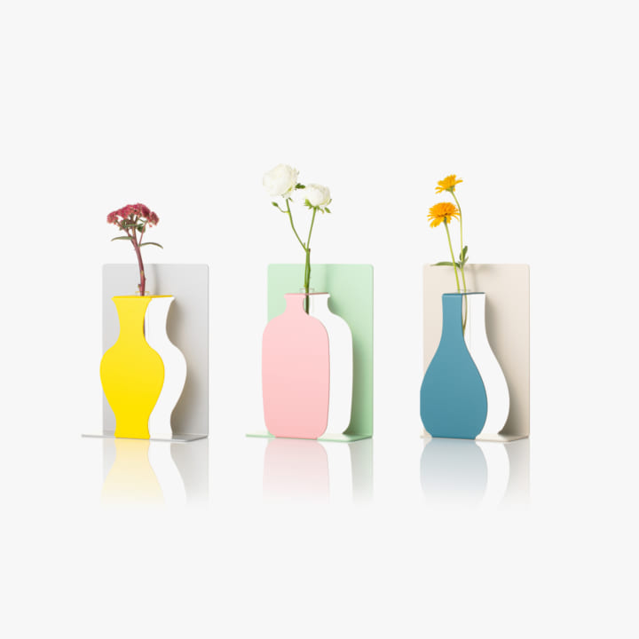 Pop-Up Vase は、1枚のスチールプレートを折り曲げて作られた一輪挿し。まるで花瓶が立体的に飛び出ているかのような形状はポップな存在感があり、花を上品に生かしてくれる。