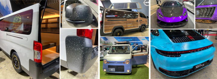 エコを感じる意匠としては、再生素材をイメージさせる木や石などの天然素材をモチーフにしたものがあり、商用車や軽自動車、スポーツカーに至るまで幅広い車格でカスタマイズを見ることができました。