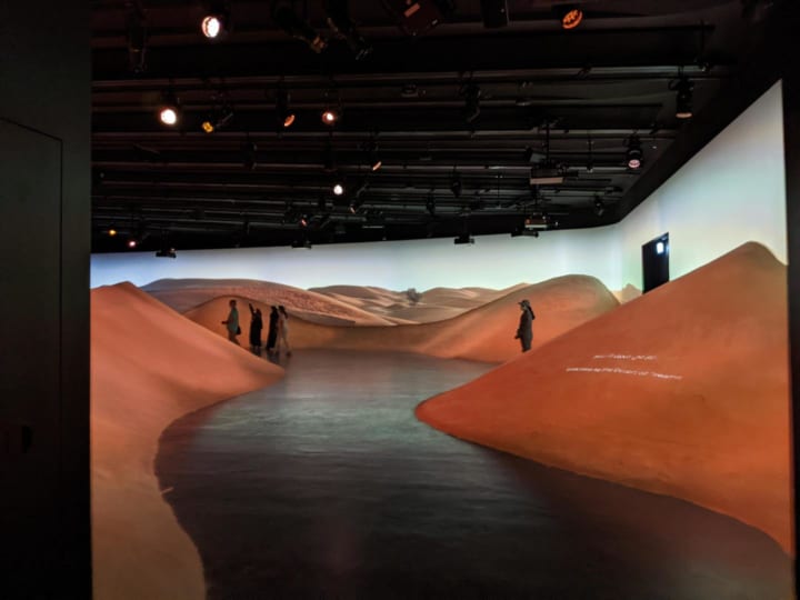 内部に足を踏み入れると、目前に広がるのは砂漠だ。これは、砂漠の中に建設された新興国であるというこの地のアイデンティティを、直接的、感覚的に示すもの。砂山の表面に映る自分の影の中に人々の暮らしが投影される仕組みで、この国を成り立たせている普通の人々の存在が感じられる。