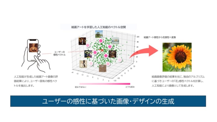 今回は、その人が美しいと推察される花を提示するデモンストレーションを実装。この心的テンプレートを用いることで、個人にとっての理想的な抽象画やインテリアデザインの作成や、過去の購買履歴に依存しないレコメンドエンジンの開発など、さまざまな形で応用することが可能だとしている。![]()