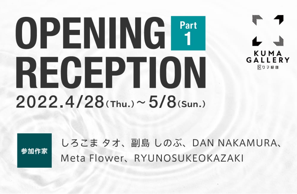 Part 1は2022年4⽉28⽇(⽊)から5⽉8⽇(⽇)まで開催。参加作家はしろこまタオ、副島しのぶ、DAN NAKAMURA、Meta Flower、RYUNOSUKEOKAZAKI。また、Part 2は2022年5⽉20⽇(⾦)から5⽉29⽇(⽇)までで、参加作家は宇都宮琴⾳、岡ともみ、川端健太、⼟屋未沙、古舘壮真、Risako Nakamuraとなっている。