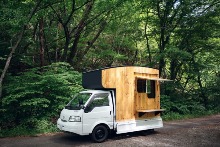 木材とマシンを融合させたキャンピングカーなど、ユニークな居住空間とファンタジックなデザイン性が特徴で、今回はキッチンシェルの仕上げに建築現場で廃材となった国産杉を使用。一枚板を継ぎはぎに貼っていくことで修繕がしやすく、使用後の再利用が可能な設計となっているそうだ。