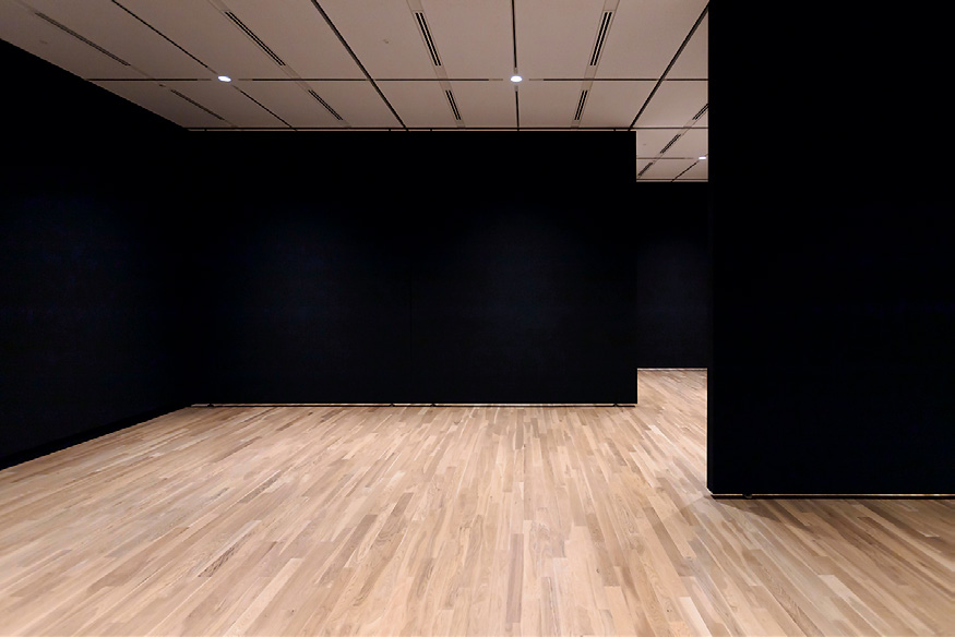▲天井高4mの4階展示室約1,400m²のうち約300m²は、重要なコレクションである具体美術協会の作品を展示する。かつて中之島にあった彼らの活動拠点「グタイピナコテカ」に存在した壁色にちなみ、黒い壁で構成されている。