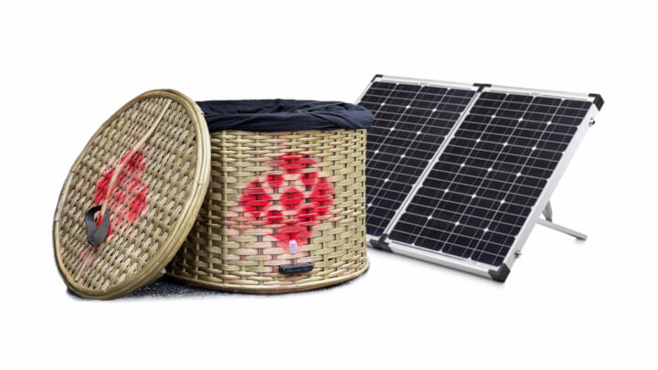 ▲軽量で持ち運び可能なソーラー式調理器具。現代社会において電力は生活にかかせないものとなっている。一方で、エネルギー資源の調達や開発における課題は、国や地域での格差があり、大きな社会問題となっている。この作品は、電力供給が不安定な地域において、その地に馴染んだ資源と方法での課題解決に挑んでおり、社会実装を考慮した持続性の高いソリューション。