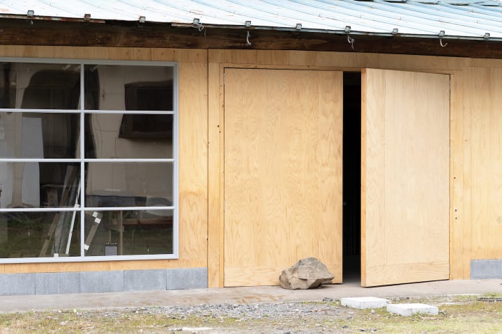 ▲益子町のアトリエ。扉やガラス窓、作業台などを自作し、少しずつ手を加えながら工具類も揃えていく予定だ。奥には、「CRACK & SHRINK」などを制作するための大きな窯を置いている。