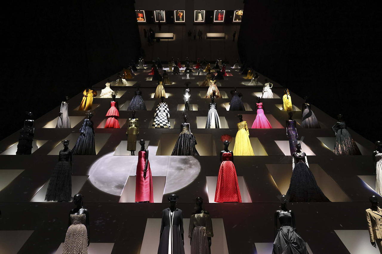 そこを抜けて突然眼下に見えるのは、巨大なアトリウム空間にそそり立つ階段のような展示だ。そこにはディオールの夜会服の数々が展示され、壮大さとゴージャスさが迫ってくる。