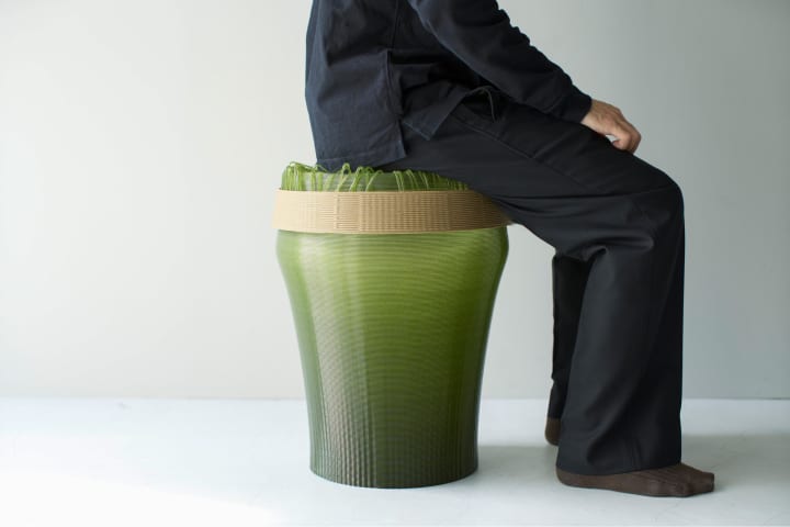 畳は、豊かな香りや心地よい肌触り、調湿や消臭などの機能性を備えた床材として古くから親しまれてきた。しかし、生活様式の変化からフローリング需要が高まり、近年では畳に触れる機会も少なくなりつつある。こうした課題を解決するためにこのプロジェクトでは、使い終えた畳や廃棄されるい草を生分解性のある酢酸セルロースと混合し、ペレット化することで、3Dプリンタによる多様な家具の制作を可能にした。
